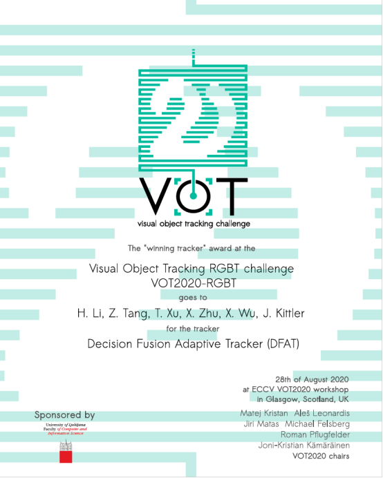 在8月23-28日欧洲视觉会议(European Conference on Computer Vision,ECCV2020)举办的视觉目标跟踪竞赛(Visual-Object-Tracking Challenge, VOT2020)中,江南大学人工智能与计算机学院教授吴小俊和英国萨里大学电子工程系教授Josef Kittler带领的模式识别与计算智能国际联合实验室(IJLPRCI)在视觉与红外(RGB-T)跟踪竞赛中夺得冠军,参赛团队成员分别是李辉、汤张泳、徐天阳、朱学峰、吴小俊、Josef Kittler,针对视觉数据和红外数据在跟踪场景中的融合难点,提出了深度决策级融合跟踪算法。