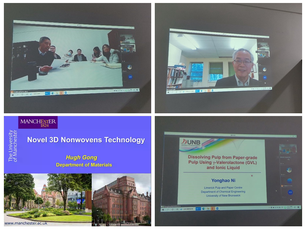 肖惠宁教授以纤维素材料与非织造材料为对象,从其憎水、水蒸气阻隔、油脂阻隔和细菌(病毒)阻隔改性等四个方面介绍了其团队目前所做的一系列研究工作以及相关研究成果;倪永浩教授在报告中首先介绍了溶解浆的相关研究背景(广泛的用途和巨大的市场需求),接着通过介绍两种常规溶解浆的生产工艺引出了其团队目前围绕溶解浆所做的一些工作——如何从纸浆中生产溶解浆;拱荣华教授以为什么选择非织造加工技术为切入点,重点从自主设计组装相关设备,以及如何控制气流制造3D纺织品等方面介绍了他们团队的研究工作。拱荣华教授及其团队开发了一系列精巧的设备,并且用这些设备制造了许多3D结构的纺织品。三位教授渊博的知识和创新的意识给参与线上讲座的师生留下了深刻的印象,赢得了老师与同学们的广泛好评。