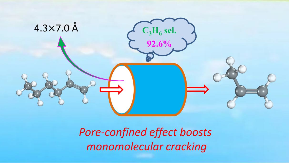 尽管直链α-烯烃容易经β-断裂生成丙烯,然而在高温裂解过程中容易发生各种副反应,主要是因为反应中间体中不同位置的C-C键断裂具有相近的能垒。特别地,在常用的分子筛催化反应中,在孔道内的酸性位点上容易发生齐聚裂解、氢转移和芳构化等副反应,导致很难实现C-C键的精准断裂以获得高选择性特定烯烃目标产物,同时,大幅增加了低价值烷烃和芳烃的选择性。