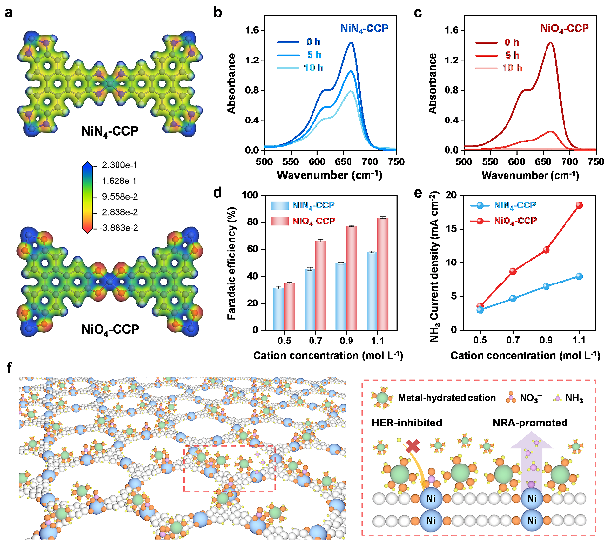 本工作以镍(Ni)基共轭配位聚合物为例,系统研究了两种分别具有NiN4和NiO4节点的共轭配位聚合物(命名为NiN4-CCP和NiO4-CCP)的配位结构对其硝酸盐电还原制氨反应过程的影响机制。电化学测试结果显示:与NiN4-CCP相比,NiO4-CCP具有更优的硝酸盐电还原制氨反应活性和选择性。在125 mA cm-2电流密度下,NiO4-CCP展现出优异的NRA性能,其法拉第效率可高达94.7%,氨产率为1.83 mmol h-1mg-1,并展现出良好的稳定性。结合实验和理论计算结果发现,配位结构调控可以有效调节共轭配位聚合物Ni金属中心的电子结构,并降低其将NO*还原为HNO*的能量势垒。此外,配位结构调控可以改变共轭配位聚合物的电荷分布,促进对水合金属离子的静电吸附,从而调节共轭配位聚合物表面的质子迁移行为并抑制析氢副反应,提升其NRA性能。本工作表明了共轭配位聚合物材料作为一类催化剂在硝酸盐电还原制氨领域具有较大的潜力,揭示了配位结构调控对其硝酸盐电还原制氨性能的影响机制,深化了对硝酸盐电还原反应过程的理解,也促进了共轭配位聚合物材料的基础研究,为新型共轭配位聚合物催化剂的设计开发提供了有益借鉴。