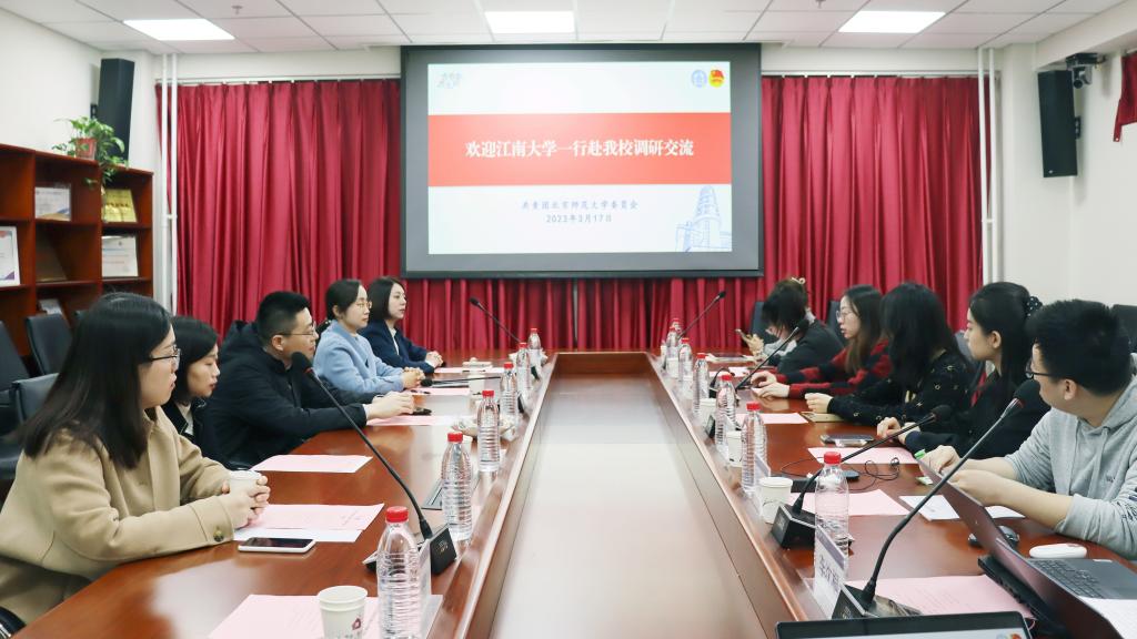 北京师范大学团委副书记卢佳琪对我校的到来表示热烈欢迎。她表示,两校都有着悠久的历史,曾多次进行合作交流,希望在未来能够继续互相学习、携手共进。魏珍吉对此次调研交流表示衷心感谢。他表示,两校有着诸多渊源和缘分,在各自校庆之际的回信更加深了两校间的情谊。他介绍了我校团委的基本情况,诚挚邀请北师大团委的师生来我校参访交流。双方参会人员就各自分管的重点工作进行了充分的沟通交流,尤其围绕思想政治引领、团学组织改革、北师大“青春讲师团”特色成果等方面交换意见。