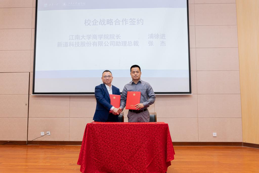 随后举行的签署校企战略合作环节,浦徐进分别与新道科技股份有限公司助理总裁张杰、上海睿当家科技有限公司董事长施振华签署了战略合作协议。商学院党委书记刘长青与张杰、施振华共同为“企业数字化商业创新培训中心”“江南大学智慧财税实训中心”揭牌。商学院副院长王雷向与会嘉宾分享了MBA教育中心新的学历提升项目及EDP中心培训项目情况。