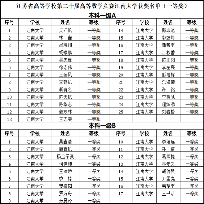 近日,江苏省高等数学竞赛组委会公布第20届普通高校高等数学竞赛获奖信息,江南学子喜获佳绩,获奖人数再创新高。本次竞赛吸引全省各高校共计约2.2万名同学参加比赛,大赛根据不同条件分别对应设置了本科一级A、本科一级B、本科二级、专科四个级别,均按一等奖10%、二等奖15%、三等奖25%,设立获奖等级。江南大学共组织492名同学参加本科一级A、本科一级B级别竞赛,在师生的共同努力下,两项竞赛级别共斩获一等奖42人、二等奖72人、三等奖128人,江南大学荣获“优秀组织奖”。