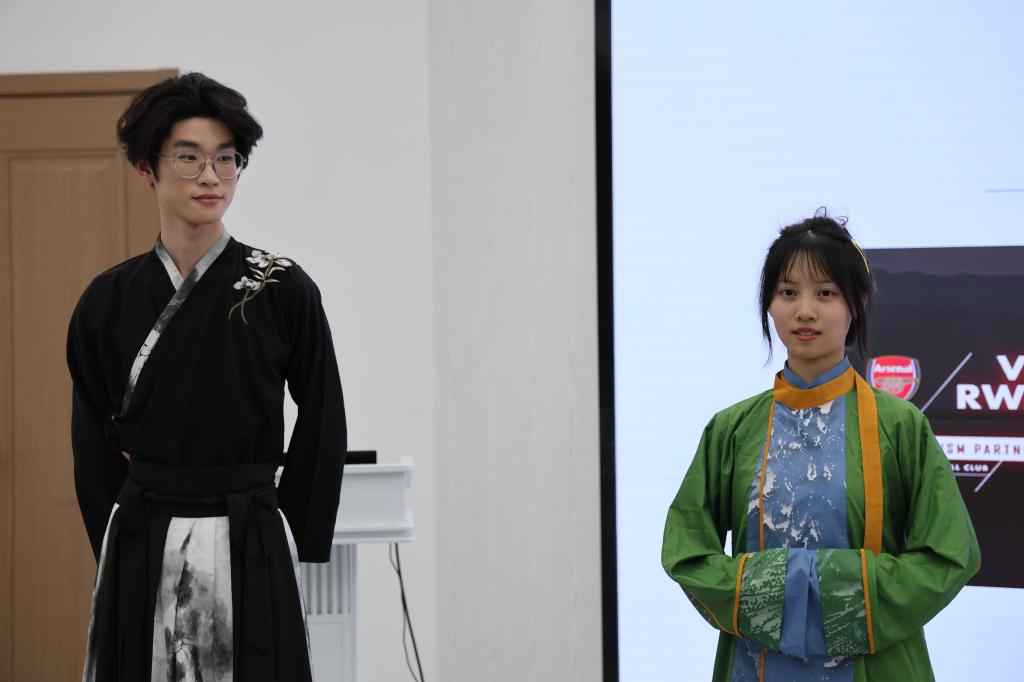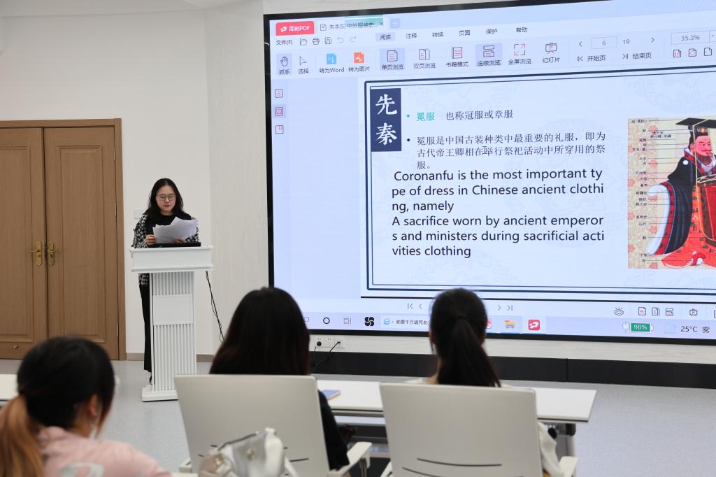 首先服艺2201团支部殷明同学向国际学生讲述了中国服装发展的不同阶段和基本特征,并通过图片和实物展示了形制各异的各时期服装,朱本东等同学身着汉服向大家展示和介绍了不同朝代的男女服饰,从一件小挂饰到一个时期的穿着风尚,再聊到当时的文化大背景,大家对服饰文化展开了深入地探讨。