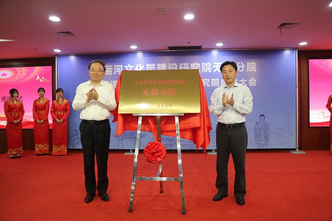 会上,李小敏和夏锦文共同为大运河文化带建设研究院无锡分院揭牌。陈爱蓓宣读《关于设立大运河文化带建设研究院无锡分院的决定》。李小敏为无锡分院院长、副院长颁发聘书。无锡市人大常委会副主任、世界运河历史文化城市合作组织(WCCO)主席朱民阳,大运河文化带建设研究副院长王健,中国大运河智库联盟总裁、董事长、首席研究员王佳宁分别以“关于无锡大运河文化带建设的三点思考”“江苏大运河与无锡运河文化的特色地位”“中国区域发展格局与大运河文化带建设趋势”为题发表主旨演讲。