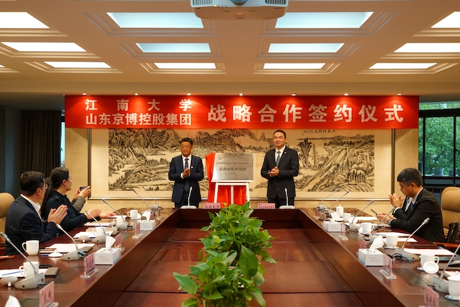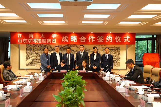 10月16日下午,江南大学——山东京博控股集团战略合作签约暨品牌创新研究院揭牌仪式在行政楼B305会议室举行。中国工程院院士、江南大学校长陈卫,产业技术研究院院长刘龙,设计学院党委书记邱建平,院长魏洁等出席会议。京博控股集团董事、总裁汪君华,副总裁李敏,南京创新中心总经理祁涛等8人代表团参加了签约仪式。会议由产业技术研究院院长刘龙主持。
