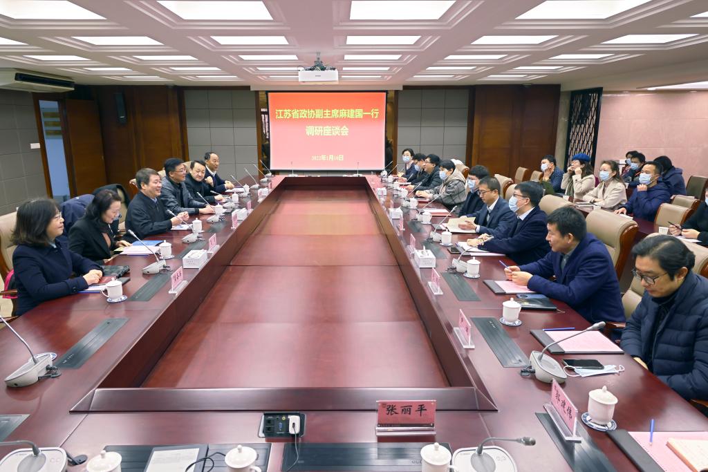 1月10日上午,江苏省政协副主席、致公党江苏省委主委麻建国,致公党江苏省委常委、无锡市政协副主席高慧,无锡市委统战部副部长李庆华,无锡市政协副秘书长龚备英一行来到江南大学调研。我校党委副书记符惠明,校党委常委、党委统战部部长、党委办公室主任朱飞,致公党无锡市委副主委、致公党江南大学总支部委员会主委刘朗等陪同调研。