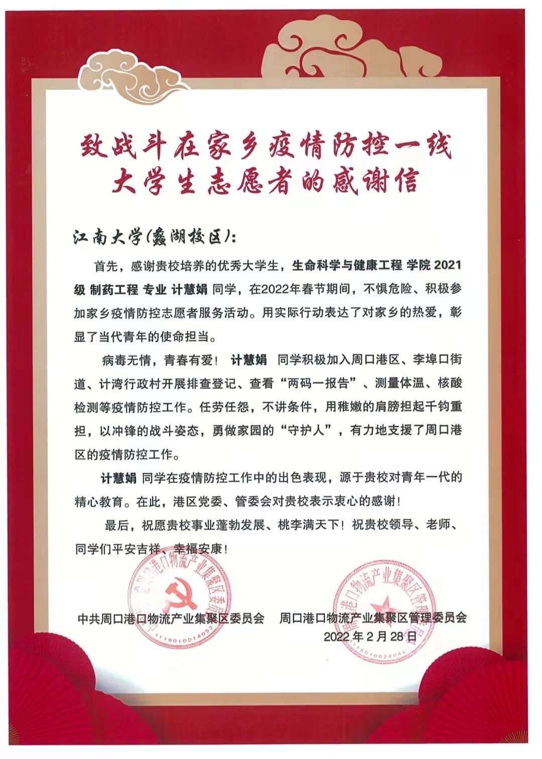 似乎一夜之间,新冠疫情再次席卷全国。疫情就是命令,防控就是责任,在生命科学与健康工程学院的号召下,我院近1/3的学子踊跃报名,主动地参与到社区疫情防控服务中,志愿用青春力量为战“疫”构筑起坚强堡垒。近日,生命科学与健康工程学院收到了一封来自周口港口物流产业集聚区的感谢信,信中对学院计慧娟同学在抗疫过程中作出的贡献表示肯定和感谢。