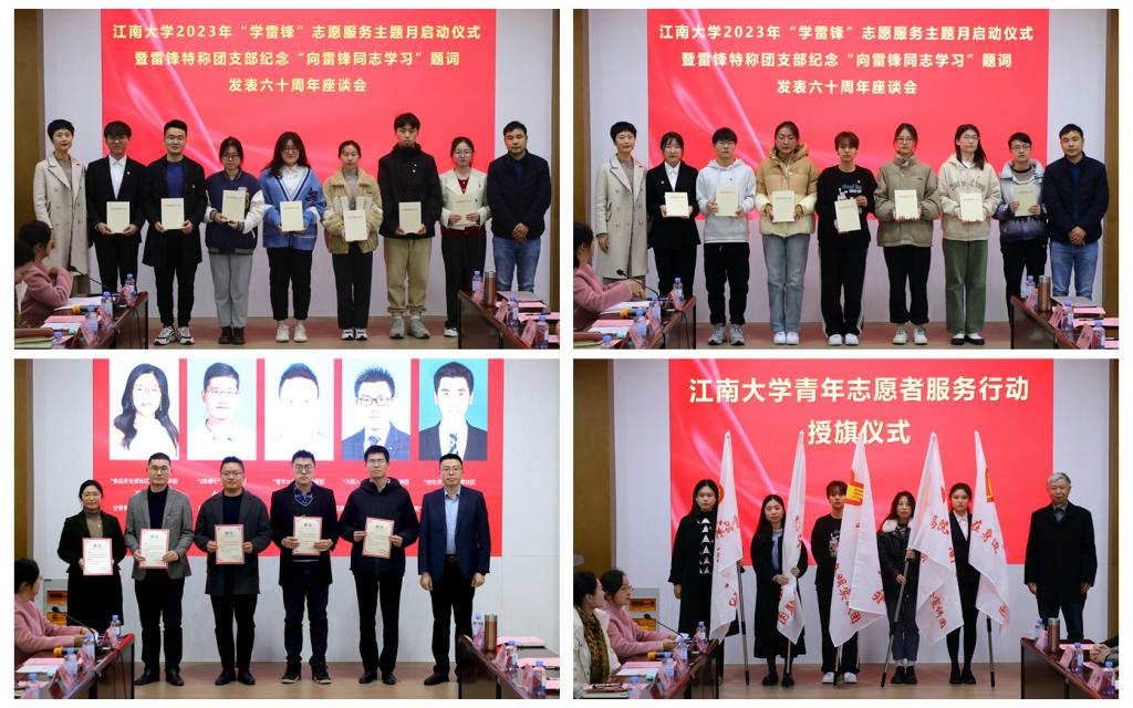 会上,梁建、李荣华向雷锋特称团支部代表赠送《论党的青年工作》。“食品安全进社区”科普宣传团、“E路潜行”文明实践团、“春禾计划”应急救援团、“马院人,理论人”理论宣讲团和“法在身边”普法帮扶团等志愿服务优秀项目团队进行了视频展示。魏珍吉为我校分析食品安全学研究所所长助理、副教授张毅,环境与土木工程学院辅导员何涛,无锡医学院分团委副书记吴杰,团市委兼职副书记、校团委挂职副书记、马克思主义学院“思想政治理论综合实践”教研部主任、副教授孙晨光以及法学院教师孙青山颁发了江南大学青年志愿者服务行动指导教师聘书。娄国栋为校青年志愿者服务行动授旗,启动了我校2023年“学雷锋”志愿服务行动。