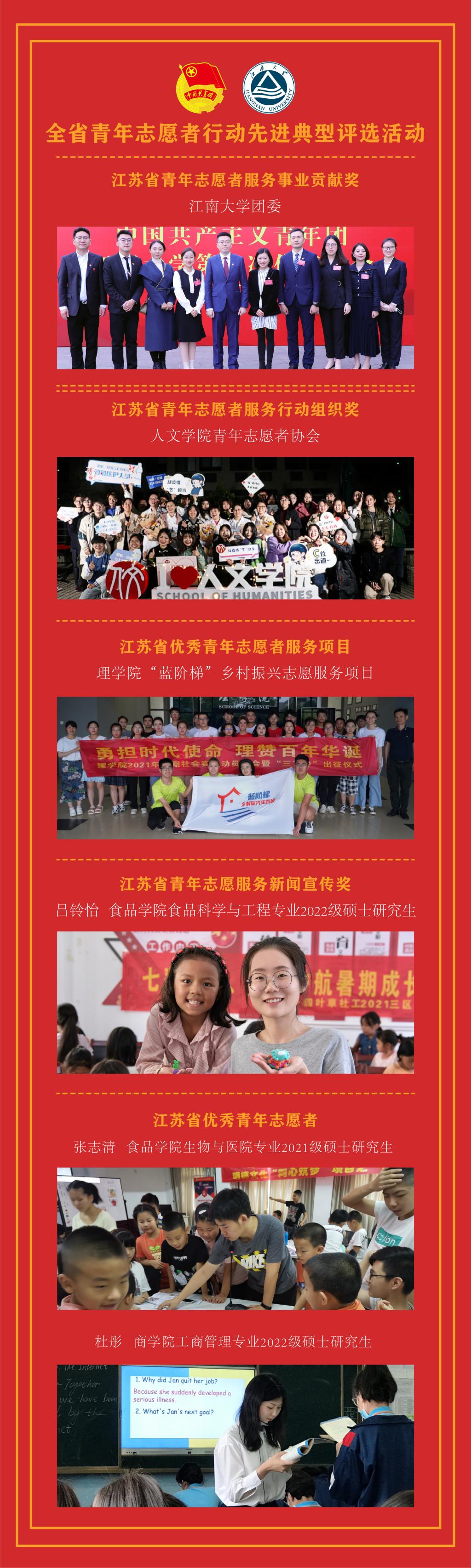 在2022年度全国高校“活力团支部”评选中,化学与材料工程学院高分子材料2019级3班团支部获评2022年度全国高校“活力团支部”最具好作风TOP100。在江苏省“青年五四奖章”和“两红两优”评选中,马克思主义学院唐忠宝老师获评“江苏青年五四奖章”,机械工程学院2019级包装工程专业1901班团支部获评“江苏五四红旗团支部”,生物工程学院学生余杨青、生命科学与健康工程学院学生孙莹获评“江苏省优秀共青团员”,校团委夏京璟老师获评“江苏省优秀共青团干部”。在2022年度全省青年志愿者行动先进典型评选中,江南大学团委获评“江苏省青年志愿服务事业贡献奖”,人文学院青年志愿者协会获评“江苏省青年志愿服务行动组织奖”,理学院“蓝阶梯”乡村振兴志愿服务项目获评“江苏省优秀青年志愿服务项目”,食品学院学生吕铃怡获评“江苏省青年志愿服务新闻宣传奖”,食品学院学生张志清、商学院学生杜彤获评“江苏省优秀青年志愿者”。