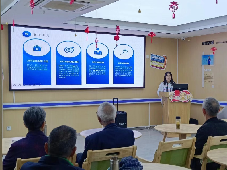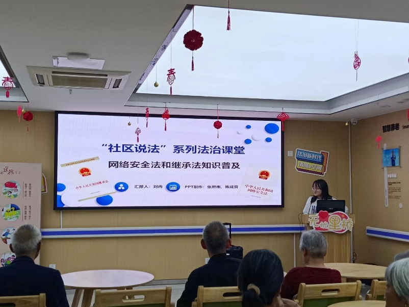 活动围绕《网络安全法》《继承法》重点内容开展宣讲。首先,团队成员刘冉为老人们科普《网络安全法》相关知识,通过讲解经典案例以及播放案例视频宣讲法律法规,并从日常生活中可能遇到的网络问题引导老人保护自身网络安全。随后,小短片《遗产继承有纠纷,看看赡养谁尽心》引出《继承法》相关法律知识,使老人们意识到继承纠纷已经成为一个普遍存在的社会问题。从法定继承、遗产继承再到两者关系,刘冉从多角度、多层次回答老人们热切关注的继承问题,并为老人们介绍了有关处理遗产纠纷问题的方法。