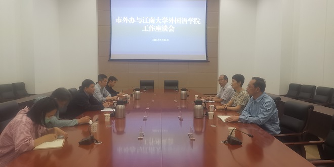 为深入学习贯彻习近平新时代中国特色社会主义思想,认真落实“学思想、强党性、重实践、建新功”的总要求,5月26日下午,外国语学院党委书记李荣华、院长方文开、副书记刘伯贤等一行赴无锡市政府外事办公室(市外办)开展调研座谈。市外办主任、党组书记詹熠主持座谈,市外办蒋勇、薛建新、彭涛、丁永洁参加座谈交流。