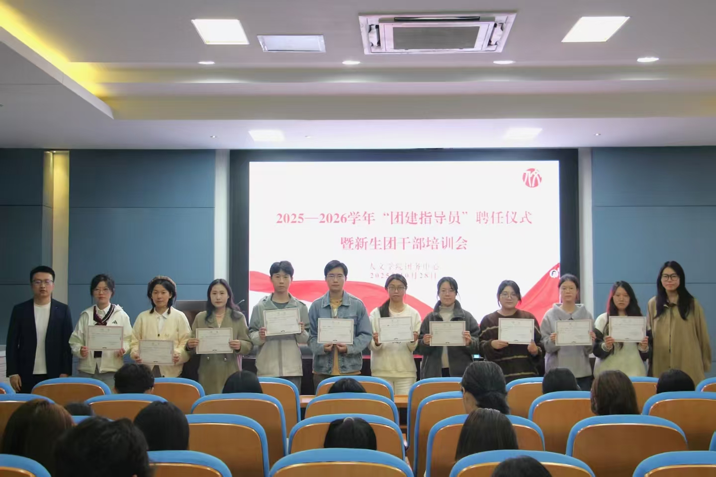 会议伊始,主持人首先宣读了《人文学院2025-2026学年团建指导员聘任名单》,随后,邓昌海与刘畅依次为团建指导员颁发聘书并合影留念。