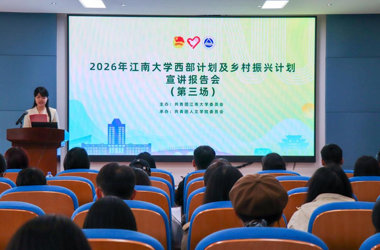 为引导广大青年学子深入基层、建设西部,4月9日下午,江南大学2026年“西部计划”“服务乡村振兴计划”第三场宣讲会在田家炳楼209会议室顺利举行。江阴团市委副书记张晓阳、江阴团市委基层社会部副部长顾怡、江南大学团委副书记王园园、人文学院党委副书记兼副院长徐璐、人文学院毕业班辅导员、“西部计划”宣讲团成员及2026届毕业生、学生党员、青马班学员等120余名同学参加本次宣讲。活动由人文学院本科生孙雅馨主持。