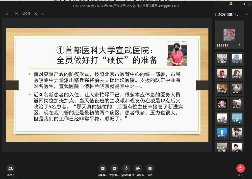 会上,预备党员王远润分享了在战疫中贡献青春力量的90后群像故事,在90后榜样身上,她体悟到,作为一名学生党员,我们需要在爱国的集体里做乐观的英雄,将青春之花绽放在祖国最需要的地方。预备党员唐义慈关注医疗前线,讲述了宣武医院、英林中心卫生院全员作战、逆风前行的动人故事,她认为在广大青年医务工作者响应党的号召踊跃“请战”的事迹中,青年党员应当铭记“为中国人民谋幸福,为中华民族谋复兴”的初心与使命。