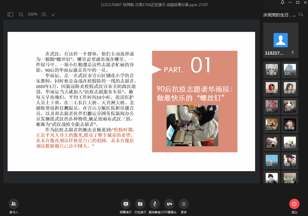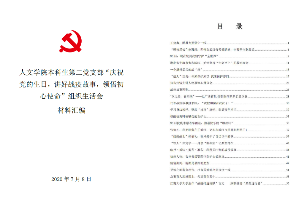 为贯彻落实党中央关于常态化疫情防控的决策部署,充分发挥高校基层党组织战斗堡垒作用和师生党员先锋模范作用,同时为庆祝中国共产党建党99周年,以战疫故事激励广大党员不忘初心、牢记使命,7月8日晚,人文学院本科生第二党支部组织全体党员及部分入党积极分子开展了线上战疫故事分享会暨“庆祝党的生日,讲好战疫故事,领悟初心使命”专题组织生活会。党员们讲述身边的战疫先进模范事迹,分享切身体会,向战疫期间的所有逆行者致敬。