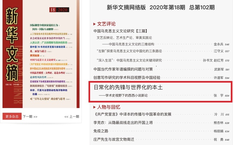 此篇论文首发于《东吴学术》(2020年第1期),作者张宇老师选取学术史视角来探讨香港作家的写作,将其纳入中国当代文学的研究领域,以日常化、世界化这一极富张力的表述打破了当下对于西西创作研究的模式化倾向,因此是一篇富有创见的优秀学术论文。《新华文摘》全文转载是对此文价值的肯定。
