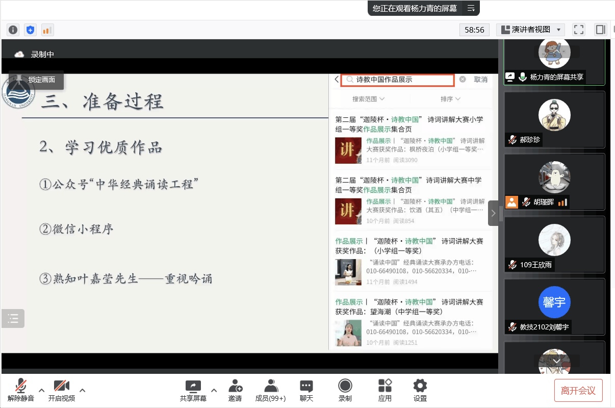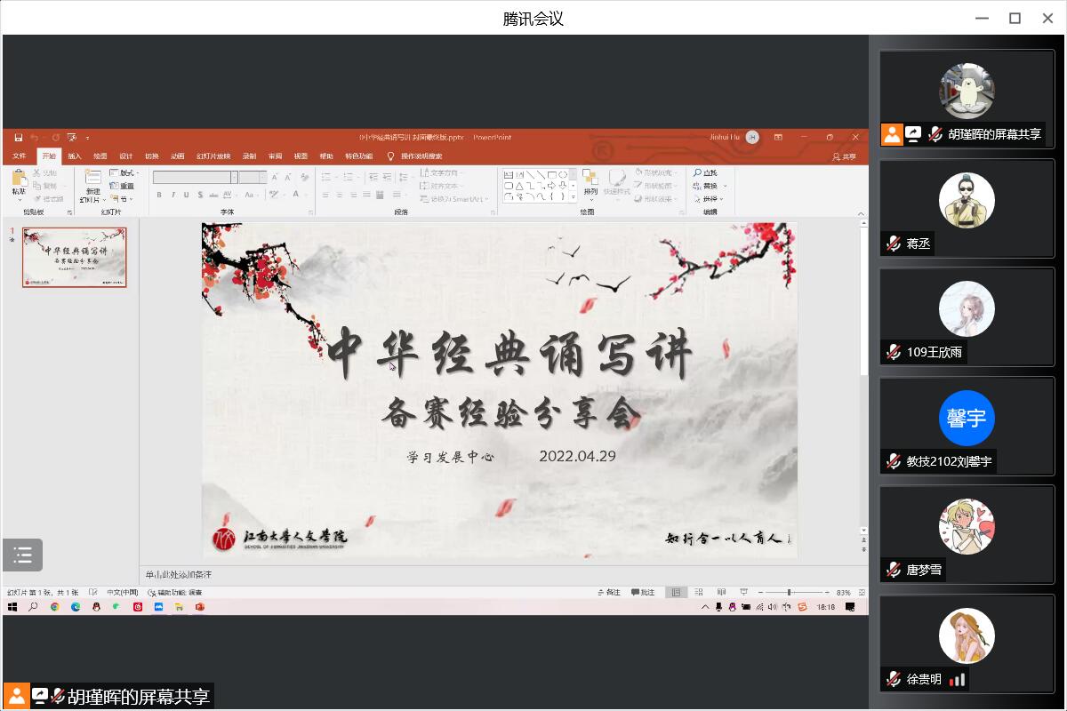 近日,人文学院第十四期真人图书馆——中华经典诵写讲备赛经验分享会在线上顺利举行,会议邀请了在第三届中华经典诵写讲大赛“诗教中国”诗词讲解大赛中荣获一、二、三等奖的何明昭、杨力青、田佳平、陈蔚祺四位同学分享备赛经验,200余多名学生线上参加。