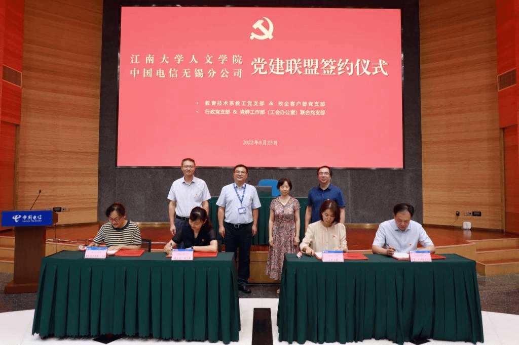 签约仪式上,人文学院行政党支部书记胡智丹与中国电信无锡分公司党群工作部(党委办公室)党支部书记、主任商杰签署党建联盟协议,教育技术系党支部书记王萌与政企客户部党支部书记、主任高芳签署党建联盟协议。四位党支部书记从党员“联学”、品牌“联创”、资源“联享”、服务“联动”四个方面,就开展结对共建活动的意义与具体思路进行了交流探讨。