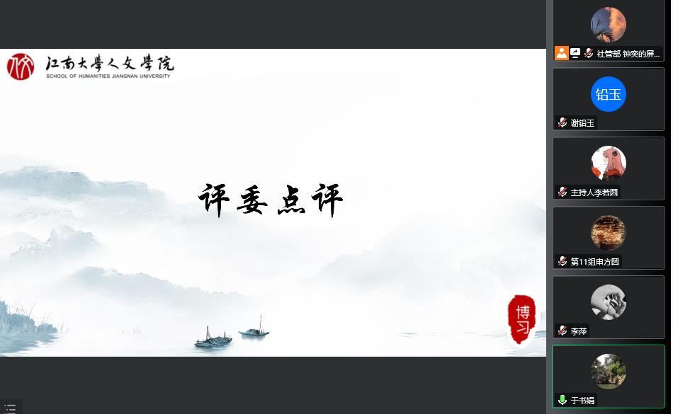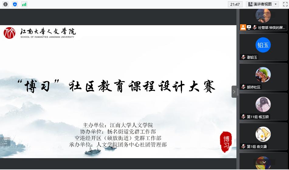 12月14日下午,人文学院“博习”社区教育课程设计大赛决赛顺利举行。人文学院党委副书记、副院长李萍,副院长于书娟,副教授田贤鹏、刘登珲、杜文彬,无锡市新吴区硕放街道党工委委员、宣传委员刘义,梁溪区扬名街道朗诗社区党总支书记陈香梅、副书记杨磊共同出席本次大赛决赛并担任评委。本次比赛由人文学院主办,由扬名街道党群工作部、空港经济区(硕放街道)党群工作部协办,由人文学院社团管理部承办,通过腾讯会议线上平台进行展示答辩。
