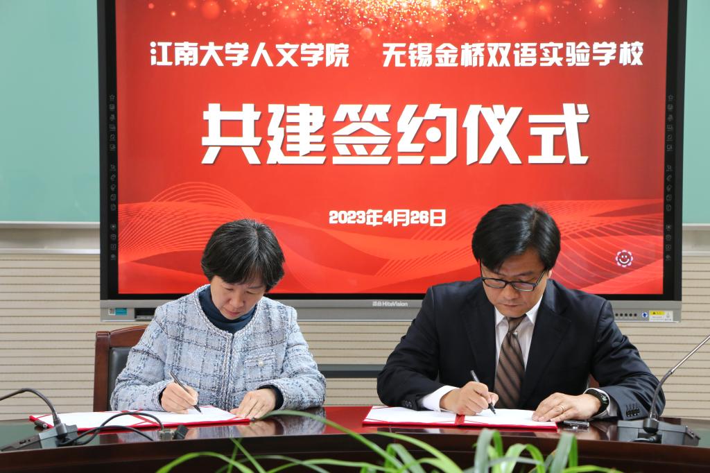 活动仪式上,马翀首先代表金桥教育集团,对姚剑英一行的到访表示热烈欢迎。他表示,江南大学人文学院文化底蕴深厚,为无锡本土和外省输送了大量优秀师资,作出了卓越的贡献。金桥教育集团和人文学院有着良好的合作基础,希望双方以此次协议签署为契机,在课程开发、科学研究、实习就业、人才培养等方面开展广泛深入合作。伍红林详细介绍了人文学院学科设置、教学科研、师资队伍、人才培养及学生就业等情况,阐述了此次访企拓岗专项行动和签署共建协议的目的和意义。他希望双方深化合作基础,不断拓展合作新空间,协同开展课程开发、科学研究、实践育人、实习就业、社会服务等合作,实现资源共享、合作共赢。随后,张静漪和高小芳分别介绍了金桥学校和金桥初中的情况,期待双方在教师培养培训、课程改革优化、项目研究、学生实习就业等方面有进一步的合作。