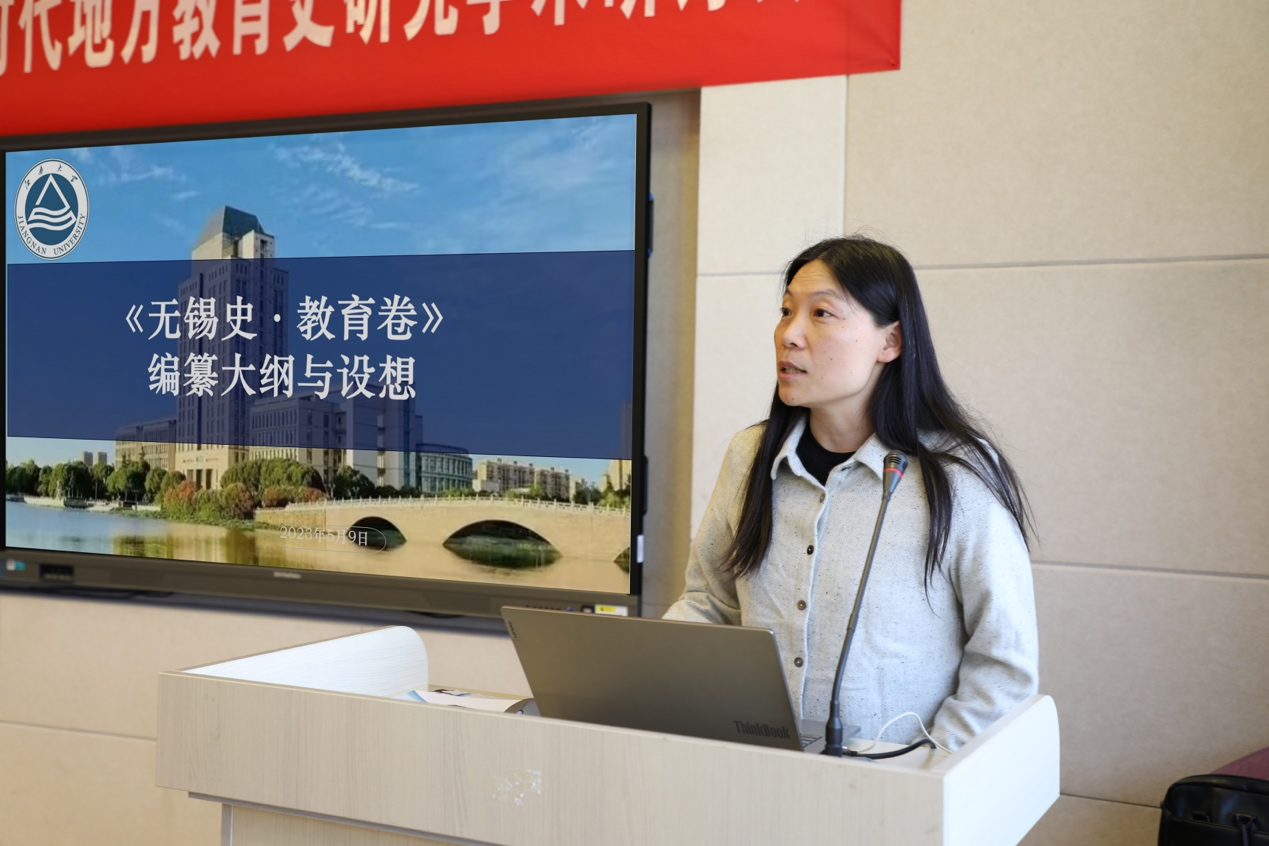 研讨会上半场由校社会科学处处长王建华主持。人文学院副院长于书娟代表编纂团队就《无锡史•教育卷》的编纂情况与编写大纲向与会专家进行了介绍,随后团队负责人庄若江教授补充介绍了她对无锡教育史主要特征的认识,希望在编纂中能够突出城市历史与教育的关系,凸显无锡教育发展与无锡民族工商业的互动与互相促进。