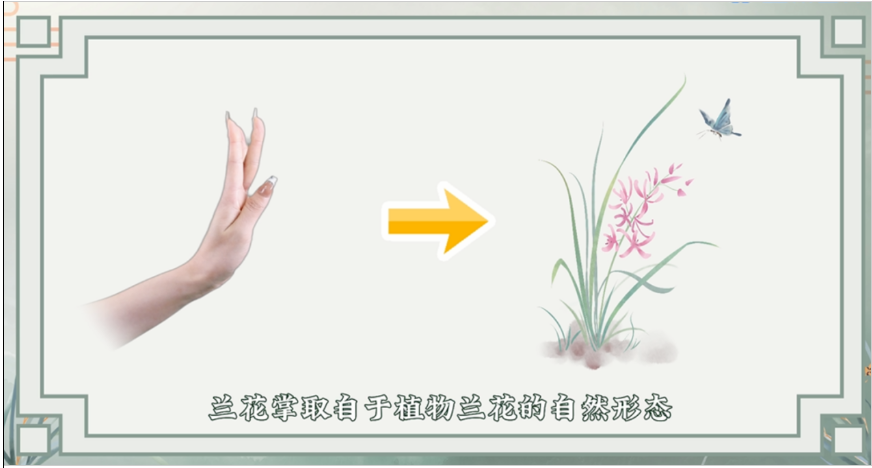 微课作品《手舞意象之兰花掌》是江苏省高校美育精品课程(公共艺术类)《舞蹈美育与综合素质教育》的代表性建设成果。在作品的开发与设计思路上,陈妍老师紧抓“以学生为中心”的课程建设思路,设计“小兰花”这一作为屏幕前学习者身份的教学代理,通过知识讲授过程中不断发问的方式,展现学生对兰花掌基础知识由浅入深的学习情况。在对兰花掌的创新性发展与设计上,教师在作品中为学生提供了一种思路,以此引导学生探索动作发展方式的多种可能性。另外,微课作品《手舞意象之兰花掌》在内容与页面设计上紧扣《舞蹈美育与综合素质教育》关于“舞承经典,立德润心”的课程定位,将“兰花掌”与中国兰花文化、中国古典诗词文化相融合,增强学习者对中华优秀传统文化的情感认同,深刻理解动作中蕴含着的清雅、高洁之美,陶冶高尚的道德情操。在页面设计方面,考虑到对学生审美素养的培养,作品在设计上格外注重视觉感受。以“中国风”为基调,结合中式风格的外框展现国风韵味,配色上选定兰叶作为主色调,花瓣色作为辅色调,让学生在学习中达到舞蹈审美素养与人文修养的双向提升。