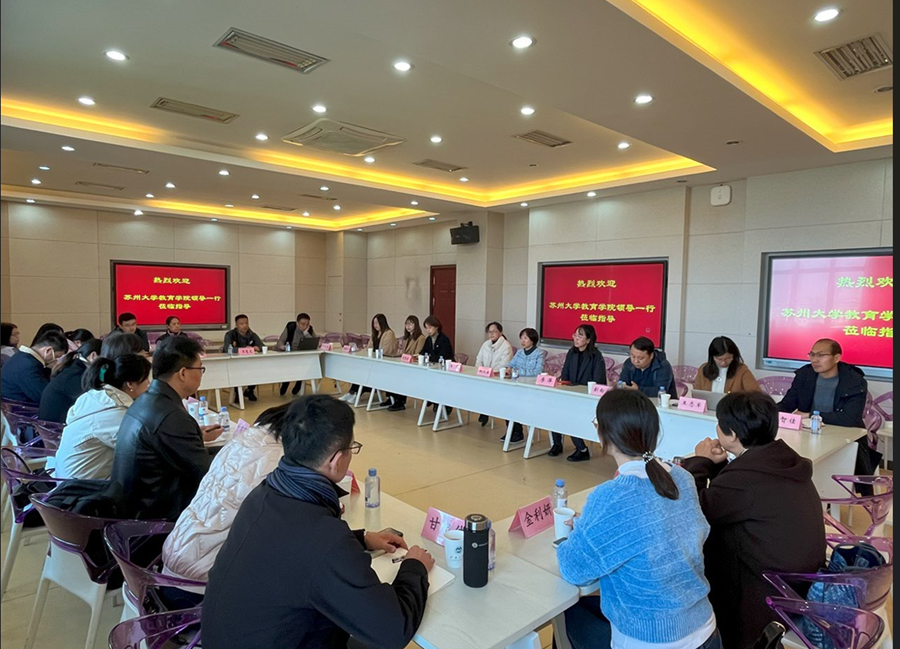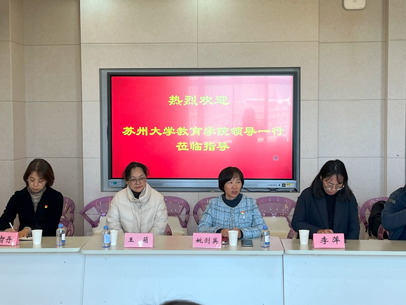 11月29日上午,苏州大学教育学院党委书记赵阳,党委副书记、副院长朱晨花携教师党支部一行到人文学院开展“党建引领 思政铸魂”联合党日活动。学院党委书记姚剑英,党委副书记、副院长李萍,副院长马志强,行政党支部书记胡智丹及教育技术系党员代表参加了座谈交流。活动由教技系教工党支部书记王萌主持。
