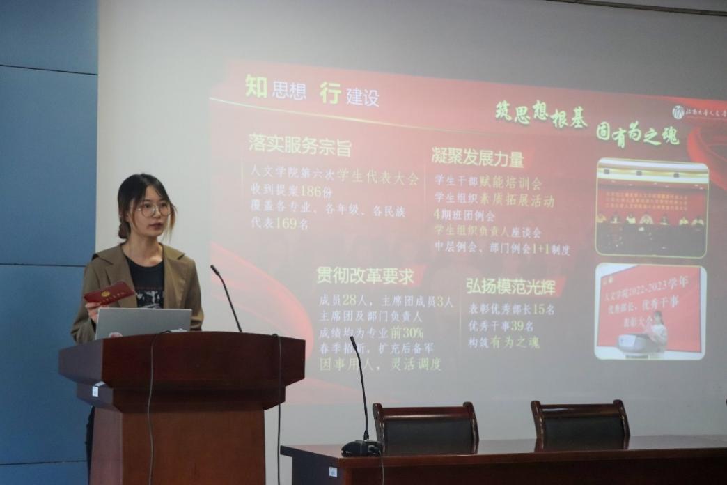 人文学院学生会、研究生会、团务中心、新媒体工作室、学习发展中心、学生事务中心、党务中心、心语心悦工作室八个学生组织负责人结合2023-2024学年工作情况展开述职。