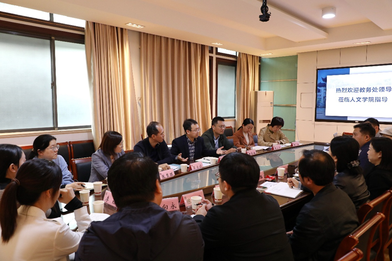 11月12日下午,教务处(教师发展中心)处长、本科招生办公室主任李兆丰,副处长黄锋林、吴宝锁、王小燕、戴云、张慧琪等赴人文学院就本科教学展开深入调研并进行指导。人文学院党委书记王晖、院长伍红林、党委副书记徐璐、副院长王芳、马志强,各系系主任与骨干教师等参与调研交流。