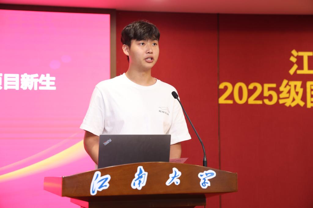 在校生代表、2024级国际教育项目学生王子儒将自己“成长与奔赴”的学习感受作了分享。他真诚寄语:“每一次出发,都值得被期待;每一次坚持,都终将有回响。”他祝愿学弟学妹们都能珍惜在江南的时光,不负热爱,不负韶华,奔赴属于自己的星辰大海。