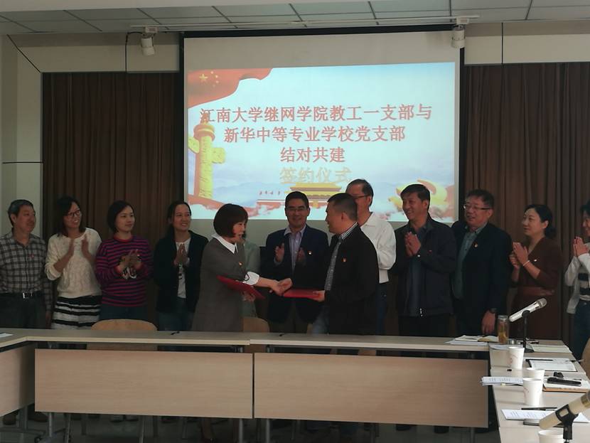 根据“不忘初心、牢记使命”主题教育,10月24日,继网学院党总支理论学习中心组成员与教工第一党支部党员到校外合作单位无锡新华中等专业学校,进行“立德树人和加强学校思想政治工作”专题学习研讨,并结合招生、教学工作进行调研。同时,学院教工第一党支部与无锡新华中等专业学校党支部进行结对共建活动。