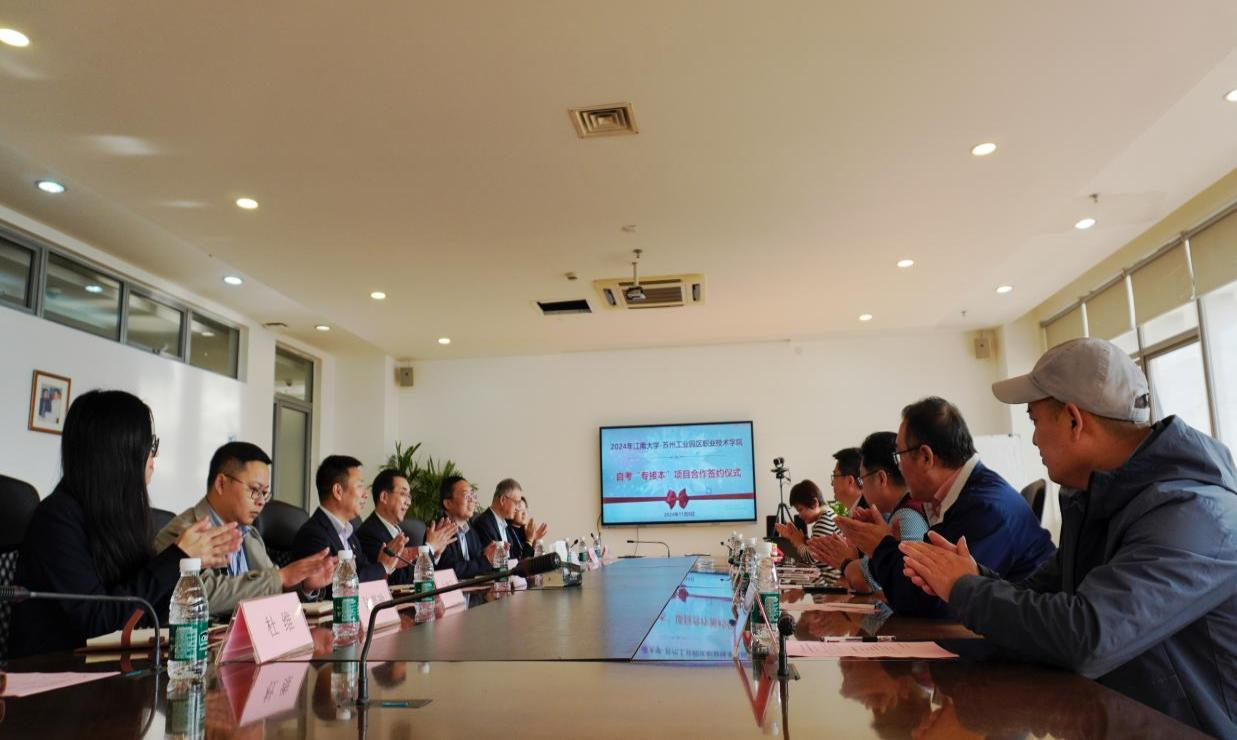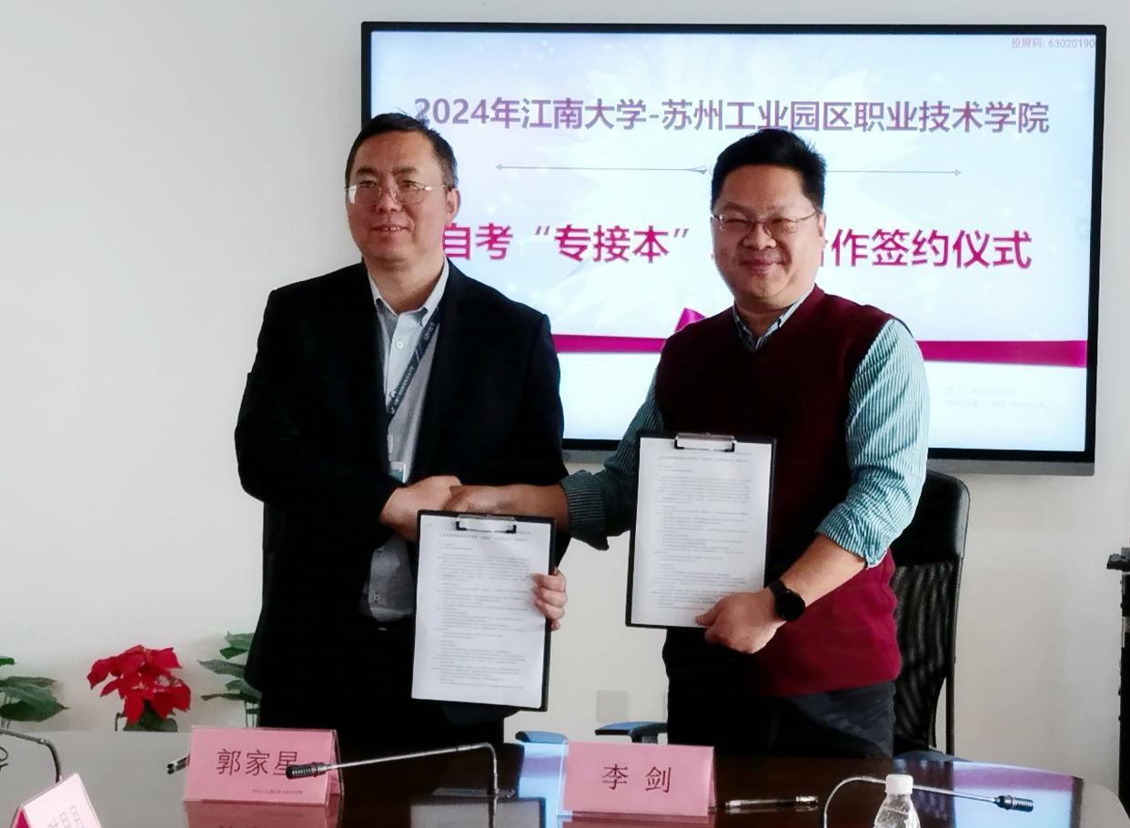 随后,李剑与郭家星分别作为双方代表,共同签署了《2024年江南大学与苏州工业园区职业技术学院自学考试“专接本”项目合作协议书》。签约仪式结束后,双方相关学院及部门的老师,就招生宣传、学生游学活动、实践课程的集体备课、论文审核把关等自考专接本项目中的具体工作问题,进行了深入的沟通交流。