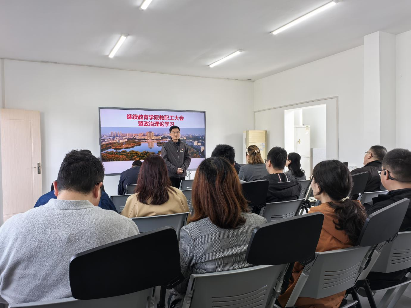 为深入学习贯彻全国两会精神和学校第五次党代会精神,深入推进师德师风建设,强化教职工的责任感和使命感,落实立德树人根本任务,4月3日下午,继续教育学院在313会议室召开教职工大会暨政治理论学习会议。学院全体教职工参加,会议由学院党总支书记张文主持。