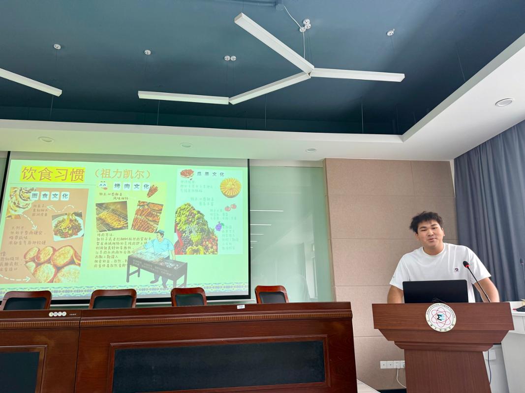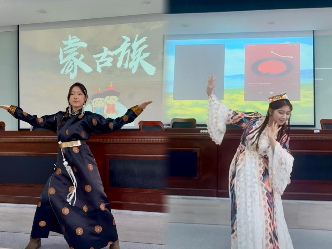 随后,来自蒙古族、维吾尔族、苗族、土家族等民族的学生代表依次登台,倾情呈现了一场异彩纷呈的文化展演。他们围绕民族的历史源流、语言文字、服饰艺术、节庆习俗、饮食民居以及音乐舞蹈等多个维度,借助PPT、视频、音乐和实物展示等丰富形式,将各自民族的独特风貌娓娓道来。蒙古族同学身着传统服饰登场,华美的纹样与精巧的配饰,尽显草原民族的豪迈与智慧;维吾尔族同学则以欢快热情的舞蹈感染全场,轻盈的舞步、飞扬的裙摆,引得师生连连赞叹,互动环节更将现场气氛推向高潮;苗族的歌声清亮悠扬,仿佛将大家带入青山绿水间,感受那份自然与纯真;土家族的传统美食介绍,则让在场师生“大饱眼福”,仿佛香气已扑鼻而来。