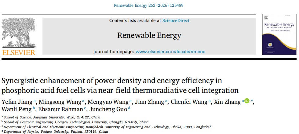 近日,光电信息与物理科学学院2022级本科生大创团队在近场热辐射电池余废热回收方面取得重要进展。相关研究成果以《Synergistic enhancement of power density and energy efficiency in phosphoric acid fuel cells via near-field thermoradiative cell integration》(通过近场热辐射电池集成,协同提升磷酸燃料电池的功率密度和能效)为题,发表在国际权威期刊《Renewable Energy》(中国科学院一区Top期刊,影响因子9.1)。