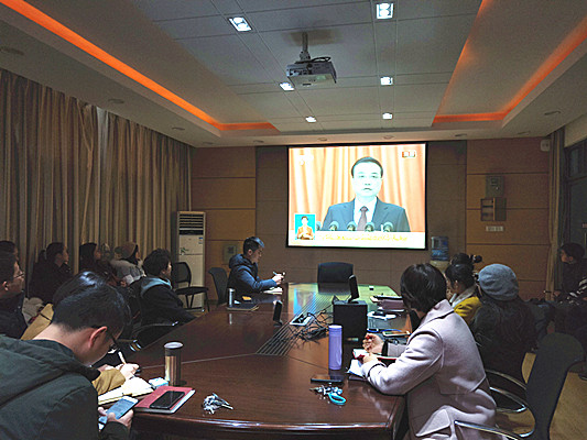 3月5日上午9时,备受瞩目的中华人民共和国第十三届全国人民代表大会第二次会议在人民大会堂开幕,国务院总理李克强作政府工作报告,理学院师生热切关注。上午9时不到,师生们早早聚集到会议室、办公室和实验室,围坐收看开幕会盛况。
