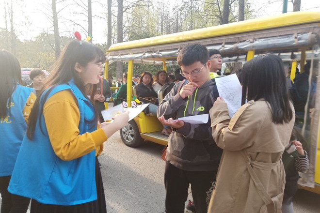 为践行环保意识,志愿者们纷纷骑自行车抵达鼋头渚,在明确分工后,正式开始了环保宣传调查活动。其中四位志愿者来到充山大门附近,利用准备好的四块环保主题展板进行宣传,吸引了不少游客驻足询问。其他四组成员分别前往鼋头渚景区不同区域进行问卷的发放和回收,对游客进行环保意识调查和宣传。