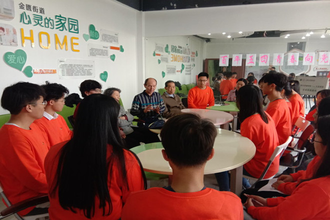 会上,由青协部员钱汪祺、周煜中、翁子阳、王萌四位同学为社区老党员带来以纪念五四运动、弘扬五四精神为主题的诗朗诵,四位同学情感饱满,展现了新一代青年的激情与朝气。之后,省级劳动模范吴老回忆了自己当初求学道路的艰辛,在机械代替人力的时代自己工作的经历,得出“要利用好现在的大好时光与时代契机努力学习专业知识,敢于创新”的结论。老党员许老回忆了自己当兵时的难忘事迹,并指出,作为一名优秀的共产党员“应该会做别人不会的,别人会的要做得更充分,时时刻刻起到一个带头作用”;党员志愿者也向同学们提到了社区的一位“活雷锋”,并回忆了自己年轻时的劳动经历,指出“一位优秀的党员应不计回报地为人民服务”。四位党员都为青年们的热情而感到欣慰,表达了对青年一代的希望,希望大家能努力学习,做新时代的奋斗者。