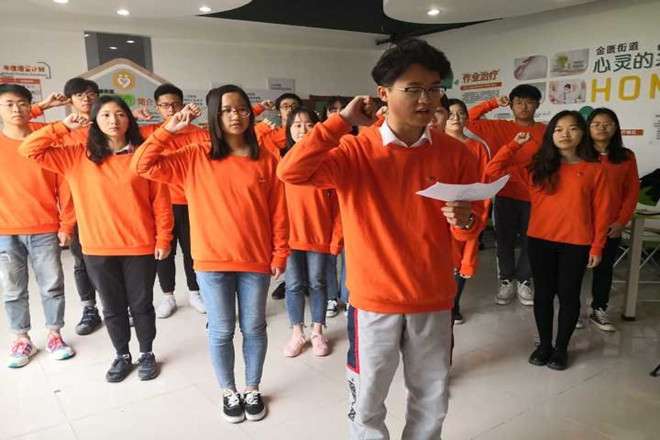 会后,四位老党员带领理学院的同学们共同为五四运动一百周年寄语,理学院青协部长邢童璐带领全体部员面向团旗宣誓。
