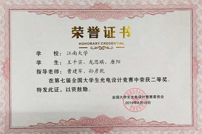 8月18-21日,第七届全国大学生光电设计竞赛在青岛大学举行。本次大赛由中国光学学会、教育部高等学校电子信息类专业教学指导委员会主办,青岛大学承办,山东省光学工程学会协办。大赛吸引了包括浙江大学、南京大学、中国石油大学、北京理工大学、华中科技大学、江南大学等全国各地178所高校1448支队伍参赛。江南大学理学院由曹建军老师指导,王千实、龙思琪和唐阳三位同学组成的参赛队伍成功通过东部赛区的选拔进入国赛,最终在197支决赛队伍中脱颖而出,获得全国二等奖。