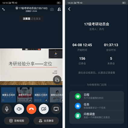 为鼓励学院2017级本科生积极准备考研,进一步调动学生考研积极性,帮助学生明确努力方向,4月8日下午,理学院借助钉钉平台,以线上的方式开展了2021届考研动员交流会。理学院院长陈国庆,院党委副书记、副院长陈周,17级辅导员苏丹,理学院2015级优秀考研学生代表罗浩、沈紫园及2017级全体本科生参加了本次直播交流会,会议由苏丹主持。会议伊始,苏丹公布了前期对2017级学生做的考研就业意向调查结果,并进行分析。