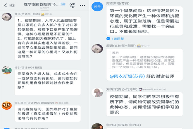 课后,同学们围绕主题进行了交流探讨,与会老师积极在线上和群组中回复同学们的疑问。他们表示此次青马课程形式独特,意义深刻,收获良多,正如习近平总书记在五四青年节之际寄语全国各族青年:“青春由磨砺而出彩,人生因奋斗而升华”, 广大青年在抗击疫情期间不畏艰辛、冲锋在前、真情奉献值得我们每一位同学积极学习。