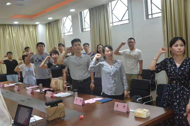 宣誓环节全体起立,面向鲜红的党旗,高唱国际歌。李丹同志带领在校的所有预备党员面向党旗宣读入党誓词。党员们高举握拳的右手,许下为共产主义奋斗终身的庄严承诺。他们表示,努力向优秀党员同志们学习,愿意在实践中接受党组织的考验。