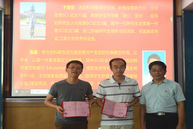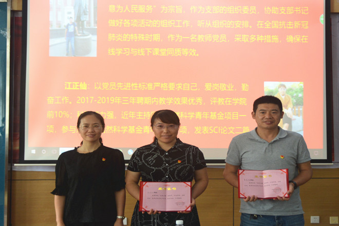王珏宣读了校2019年度“最佳党日活动”获奖名单和校首批“双带头人”教师党支部书记工作室拟立项名单。应用数学系党支部、信息与计算科学系党支部分别获此殊荣。陈国庆宣读了《关于表彰理学院“先锋工程”先进党支部和优秀共产党员的通知》,授予信息与计算科学系党支部、光电信息科学与工程系党支部“先进党支部”荣誉称号,授予卞宝安、陈周、陈晶、曹俊峰、江正仙、王继成、席曦、朱纯、张景祥等9名同志“理学院优秀共产党员”荣誉称号。
