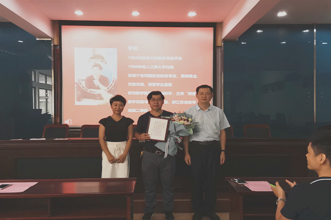 今年九月,由理学院上海校友会部分校友发起,决定自2020年起在江南大学理学院设立“桃李奖教金”,以推动江南大学理学院教育事业的发展,鼓励教师教好书、育好人,培育优良的师德师风。经教师个人申报,院党政联席会议讨论推荐,“桃李奖教金”评选委员会沟通议定,授予大学数学部刘维龙老师首届“桃李奖教金”之教学质量奖。陈国庆院长为刘老师颁发奖杯。