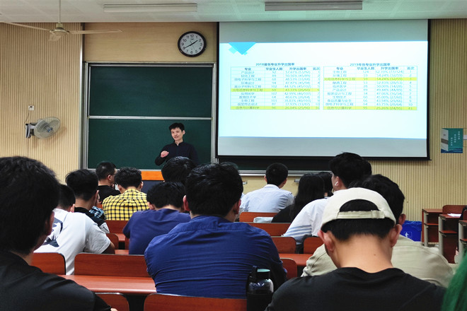 首先,陈周介绍了往届毕业生升学率逐年上升的整体情况,引导同学们“识大势,做大事”,从专业责任和专业目标出发对21届考研同学赋予使命,进行激励。