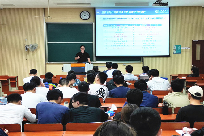 最后,由胡国顺就“后疫情时代高校毕业生就业市场”进行分析,从总体就业形势严峻、就业渠道发生变化、用人单位招聘模式变化及对策出发,鼓励同学们积极参加秋招把握机会、勇敢投递简历、仰望星空时也应不忘脚踏实地,向就业同学推荐使用校内智慧就业平台,可谓干货满满。