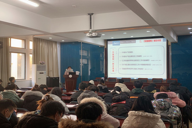 李丹主讲“大学生入党程序和要求”。她先介绍了学院的党员情况,然后对《江南大学发展党员工作实施细则》进行了解读,主要介绍了入党积极分子是如何确定和培养教育、发展对象是如何确定和考察、预备党员是如何接收、教育、考察与转正。强调了发展党员工作的注意事项,以及积极入党学生要以学为本。并在总结中介绍此次培训采取专题讲座和寒假自学相结合的形式,涉及理论学习、主题实践、观摩学习及成果交流等部分,引导青年学子在学思践悟中端正入党动机、坚定入党决心。