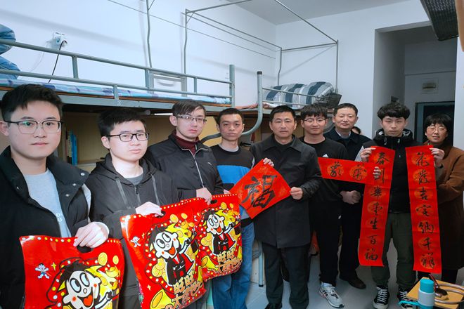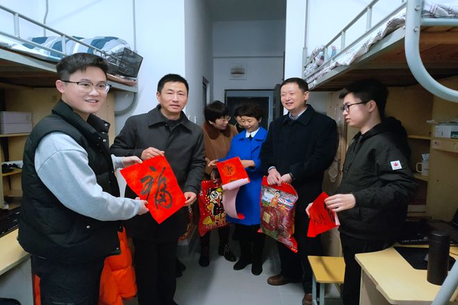 戴月波等一行人来到理学院学生集中安排的鸿苑住宿园区。戴月波亲切问候留校学生,询问他们留在学校生活和学习方面是否适应,生活作息安排是否科学合理,并了解留校研究生的论文和实验的进展情况,安慰他们不要着急,慢慢来,利用好寒假留校时间实现弯道超车。随后,戴月波等人给留校学生送上了新年“旺旺大礼包”,寓意在新的一年,同学们在学习、生活方面继续保持旺盛的热情和活力,更上一层楼。同时,戴月波还给四个宿舍送上春联,这是理学院请宣传部胡奕老师特意为留校同学准备的爱心礼物,在这简单的文字中,体现了学校和学院对留校学生新的一年的美好期盼。王珏提前预祝留校学生度过一个难忘、特殊的新年,祝愿同学们开开心心过大年;陈国庆叮嘱同学们随时随地和学院老师保持联系,有任何困难都随时向学院反映,学院会第一时间回应并积极解决,希望大家在新年里一切顺利。